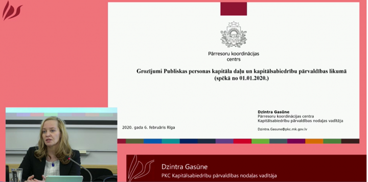 Videokonferencē piedalījās Pārresoru koordinācijas centra Kapitālsabiedrību pārvaldības nodaļas vadītāja Dzintra Gasūne, kura pastāstīja par pārvaldības likuma grozījumu mērķi un Ekonomiskās sadarbības un attīstības organizācijas (OECD) vadlīnijām par valsts kapitālsabiedrību korporatīvo pārvaldību un praksi (kapitālsabiedrību vispārējo stratēģisko mērķu noteikšana, līdzdalības regulējums finanšu un nefinanšu mērķu noteikšanai, to finansēšanas avoti u. c.).